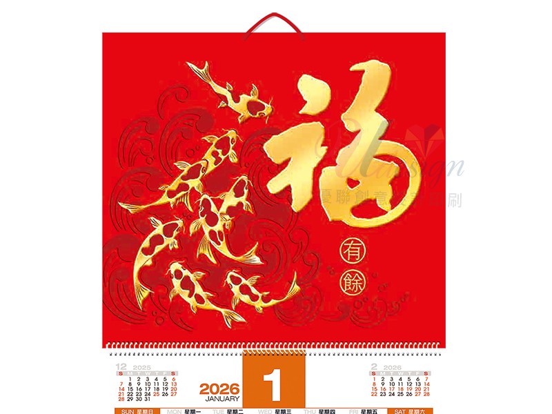 富貴有餘燙凸金掛曆採用了燙金和打凸等多項精緻工藝,將月曆的特色呈現得淋漓盡致。燙金工藝為掛曆增添了華麗的金屬光澤,而打凸技術則使得圖案更加立體和生動,這些細膩的工藝讓掛曆在視覺和觸感上都極具奢華感。